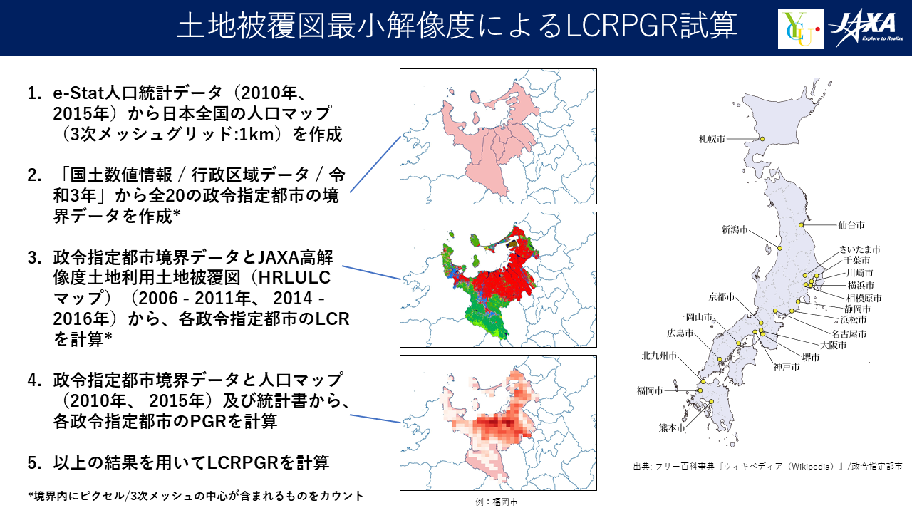 JAXA「高解像度土地利用土地被覆図(HRLULCマップ)」と国土交通省「国土数値情報行政区域データ」の境界データを用いて、境界内における土地被覆図の土地利用率(LCR)を算出している。人口増加率(PGR)は総務省「国勢調査」の総人口を用いて算出している。以上を用いて、人口増加率と土地利用率の比(LCRPGR)を算出している。