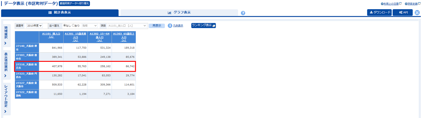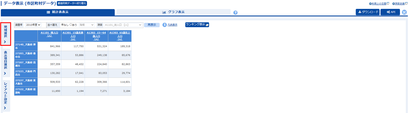 (選択地域:「大阪府 堺市」「大阪府豊中市」「大阪府 高槻市」「大阪府 門真市」「大阪府 東大阪市」「大阪府 能勢町」、選択項目:「総人口(人)」「15歳未満人口(人)」「15~64歳人口(人)」「65歳以上人口(人)」の例)