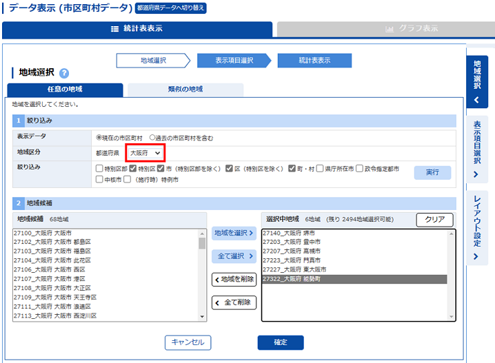 (選択地域:「大阪府 堺市」「大阪府 豊中市」「大阪府 高槻市」「大阪府 門真市」「大阪府 東大阪市」「大阪府能勢町」の例)