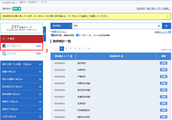 2. 「検索結果絞り込み条件」-「データ種別」の「データベース」を選択します。